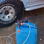 Достаточно опустить один конец шланга в любой источник воды, будь то баклажка, ведро или речка и можете приступать к мойке вашего автомобиля.